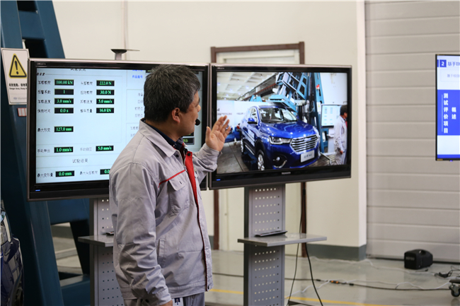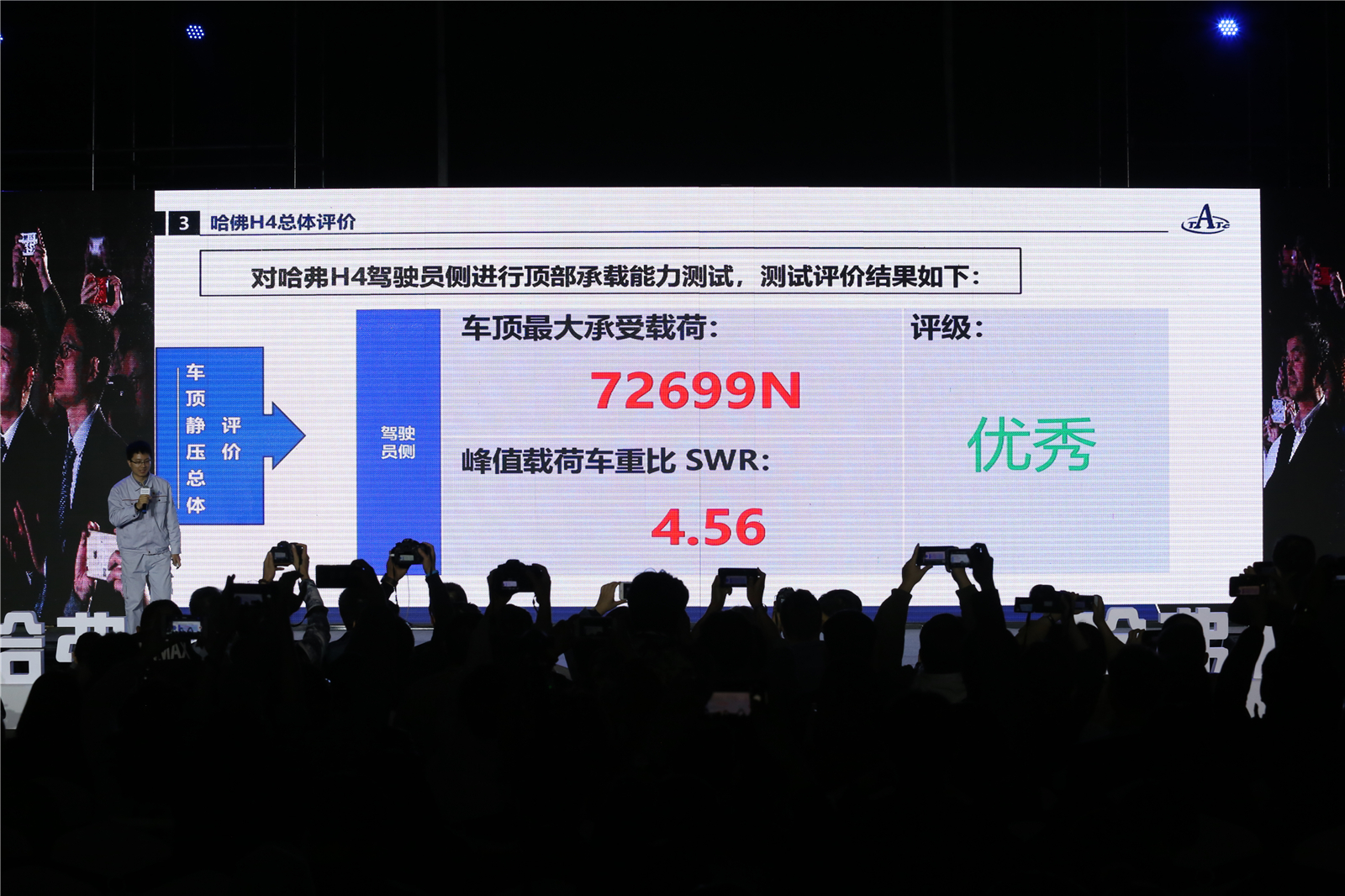 试验现场,工作人员将一辆哈弗H4刚性地固定在刚性水平面上,关闭所有车窗,关闭并锁死所有车门。加载装置沿垂直于下表面的方向向下移动,直至载荷的大小达到官方要求。现场还有来自全国各地的300多位媒体见证了此次试验,对哈弗H4的最终成绩都十分期待!