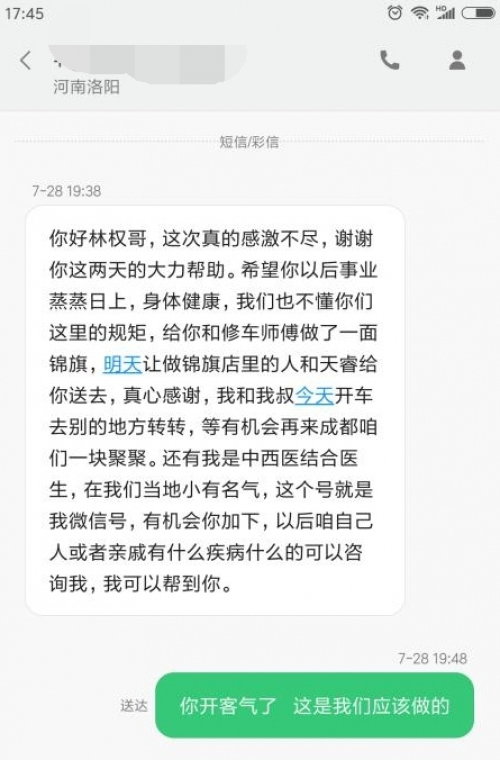 当天晚上19点车主给技术经理林权发来短信告知为表示感谢,自己已经找广告公司做了一面锦旗并托人在次日送到我公司。