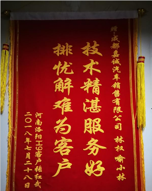 长达十天的辗转颠簸的修车过程中,车主张红武从一开始的焦虑不安到后来满心欢喜的离开,以及客户发给林师傅的感谢短信。这一过程,让我感受到身为汽车人的使命感和自豪感。正如锦旗上所写“技术精湛服务好,排忧解难为客户”,这是我们尊龙凯时汽车自2006年成立以来为“成为中国西部领先并受尊敬的汽车服务运营商”不懈努力的写照。