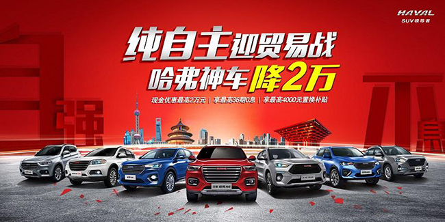 为回馈消费者,11月1日,哈弗正式宣布在11-12月期间,开展“纯自主迎贸易战哈弗神车降2万”活动,让消费者能享受到更大的购车优惠。其中,哈弗M6官降2.4万元,售价6.6万元起;哈弗H6运动版优惠2万元,售价8.3万元起。此外全新哈弗H6、新哈弗H6 Coupe、哈弗H4、哈弗H2/H2s等部分热销车型,均有1.4-1.8万元的大幅优惠。