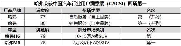 其中,哈弗品牌获售后服务满意度、销售服务满意度两项第一;哈弗H6获10-15万A级SUV用户满意度第一,累计4年获此殊荣;哈弗M6获7万级以下A级SUV用户满意度第一名。